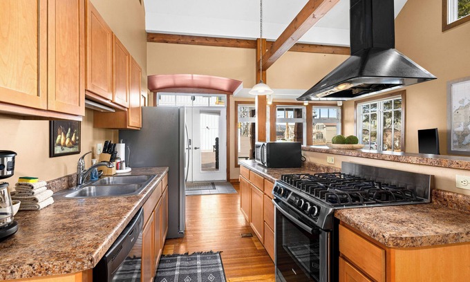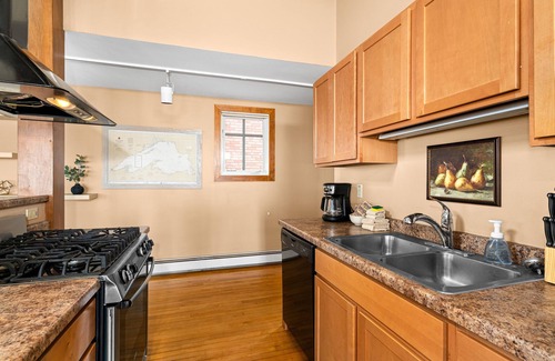 Your Park Point vacation starts at Dragestil! Named for the architectural style of the home, Dragestil ("Dragon Style") is a style of design and architecture that originated in Norway featuring decoration in the form of dragon heads with steep roofs and big eaves. You will be hard pressed to find a more unique location in Duluth. This 1st floor Scandinavian condo is sleek, stylish, and loaded with extras. The best part of staying here is being close to everything! You can walk to the beach, the lift bridge, all of the shops and restaurants in Canal, or just soak up a front row seat to the iconic lift bridge that makes Duluth special. You'll love entertaining your family and friends in this open concept space. Gather around the beautiful kitchen island, get cozy on the living room sectional, or feel the sea breeze while enjoying your morning coffee on the deck. This condo has a loft style bedroom with a king size bed, a queen day bed, a well appointed kitchen and a spacious handicap accessible bathroom you'll love getting ready in. Whether you're sipping your morning coffee, watching the sunset, or exploring nearby hotspots, this space has it all.