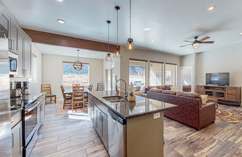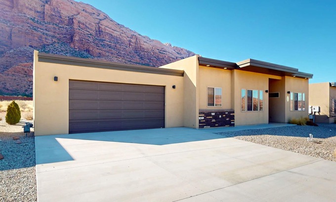 Come experience luxury and comfort in the desert with this three-bedroom home in Moab boasting a private hot tub and mountain views. You'll also have free trailer parking and a garage to park your vehicle (with additional trailer/overflow parking), as well as easy access for guests with limited mobility.
