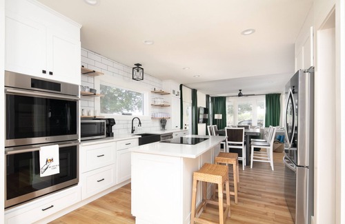 The 4 car garage has been converted to a hangout space with bar, two couches, and 85" TV. Please note that this is garage space and while we have made every effort to seal it, it still does get bugs from outside.