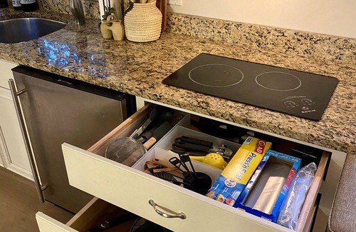 The wonderful spacious guesthouse (above the garage) features a fully stocked kitchenette (mini-fridge, cooktop and microwave), separate bedroom with a beautiful large king bed, large bathroom (entry from bedroom and living room), and a very comfortable queen size pull out sofa.