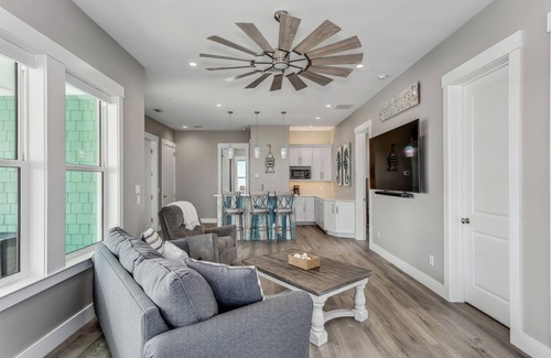 The second or top floor contains the main living area , kitchen, and primary bedroom with ensuite bath. A half bath is located just off the living area for convenience. The living area is outfitted with comfortable couches for lounging on and a large flatscreen TV. One of the couches is also a queen sleeper sofa. The kitchen has a long bar and is stocked with everything you might need to make a quick snack before heading to the beach or dinner for a crowd at the large dining table. Floor to ceiling windows bring the outside in so the beautiful Gulf views can be enjoyed while cooking or relaxing with family after a long day at the beach. The laundry area with a full size washer and dryer is also on this floor. The primary bedroom offers a king bed and the ensuite bath has a soaker tub and large walk-in shower. The primary bedroom also opens to the hot tub deck so you can sneak away for a soak and take in the views. The second floor balcony can be accessed from the living/dining area and the cozy seating invites you to relax after a homecooked meal and relax surrounded by the emerald waters and the sugar white sands of Navarre Beach. Complimentary WiFi, gas grill and outdoor shower.