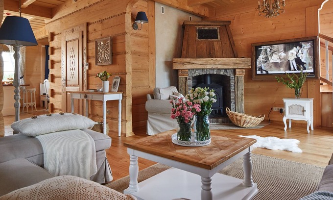 Luxury all-year-round highland style villa located near Zakopane - winter capital of Poland. Total area of 230sqm with 6 bedrooms, 5 bathrooms, 2 living rooms, fully equipped kitchen, dinning area, fireplace, sauna and a large terrace. Free high speed wifi Internet in the house and a satellite TV. Private jacuzzi outside. Our guests have an unlimited access to 2 heated pools located at the property. The villa is a part of Osada Maruszyna - luxury wooden villas for rent. We are located just around 15 km from the ski slopes of Bialka Tatrzanska and around 16km from Zakopane and Tatra Mountains.