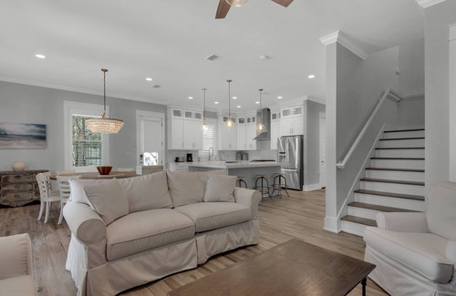Floors the color of driftwood, delicate gray walls, and fresh white décor cause you to breathe a sigh of contentment when you enter through the front door and take in the open floor plan. You have arrived for your perfect Florida beach vacation. A stunning fully-equipped kitchen, ample dining space, and furniture you’ll wish to sink into after a glorious day at the beach, offer the first tantalizing glimpse into this Destin vacation rental home.