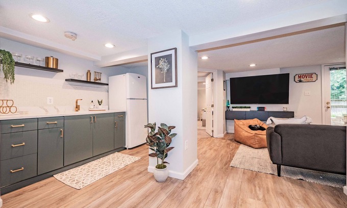 Grand Haven offers a professionally designed luxury retreat and mid century modern charm. Designed for long term stays, its central location is a short walk to the metro, large parks & downtown Vienna. The home is fully equipped as your comfortable home away from home. Work from home in the dedicated office. Cook with high end appliances. Enjoy the magical private yard from the outdoor swing or fire pit. Workout on the Peloton before a family competition on the Nintendo Switch or the arcade.