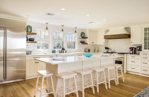 The kitchen is modern and sleek with white quartz countertops, all stainless steel appliances, white cabinets with soft close features and some with glass faces with soft accent lighting. The white subway tile backsplash makes this kitchen inviting to all. There's more than enough room for food for the clan in the large stainless steel fridge. The traditional ceramic farmers' sink is punctuated with three beautiful light blue glass lights overhead. The 6-burner stove has double ovens and a distressed wood hood, microwave in the center island, and dishwasher hidden behind a cabinet front round out this magnificent kitchen. The kitchen is anchored by a long white island with quartz countertops and additional seating for 6 - this is where you'll find the wine fridge and more storage. The kitchen comes fully equipped with beautiful white china service for 18 or colorful melamine (high-end plastic) dishware for the kids or more casual dining.