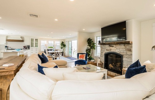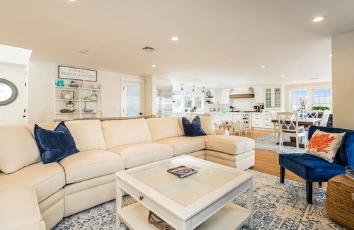Take in the open concept living room, dining room, and kitchen. The living room boasts a huge wrap-around couch that seats 10 and ends with a chaise lounge. The large screen TV and gas fireplace are centered right in front of you with the views of the ocean in the background. Gather the family for a Red Sox game or movie night!