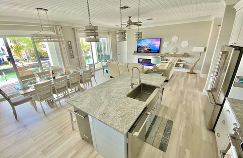 Everyone knows the three most important rules about real estate...Location, location, location. This 4 bedroom luxury home with 100 ft wide canals is located in Key Colony Beach and is only a two minute boat ride from the Atlantic Ocean or the Gulf of Mexico. No long idle transits to get to where you want to go. The home is new with high end finishes, furniture and appliances. Other than location, what’s the most important thing you want in a Florida Keys vacation home?...Outdoor living and entertainment area of course. This home has a one of the largest covered outdoor living spaces you’ll find (approximately 2000 sq ft). We just installed a complete outdoor kitchen with a premium stainless steel bar and grill. It also has a 65 inch HD TV (great for watching sports while grilling the freshly caught fish). Recently added curtains now give the outdoor living room suite more privacy and shading. Two large umbrellas around the pool and dining area provide additional shade. No vacation home would be complete without a heated/chilled swimming pool to handle your whole crew. An outdoor shower for those of you who like to be closer to nature. Separate guest quarters downstairs by the pool (Cabana) with it’s own kitchen, bathroom, a king bed and sleeper sofa. 2 suites upstars with king beds. The 3th bedroom has two extra long twin beds made up as a king but can be separated into two single beds upon request. All bedrooms have HD TV’s with a 70 inch OLED HD TV in the living room. For a cozy feeling inside we recently installed a custom electric fireplace and mantle. On the upstairs deck, electric controlled blinds provide both privacy and shade. The western exposure gives us beautiful sunsets. Thank you very much for your interest. We hope you plan your special vacation in our beautiful home.