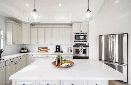 This elegant home features four bathrooms with brand new fixtures, including double vanities and marble countertops. Guests will find shower and tub combo's in all of the bathrooms except the master bathroom, which features a full size tub and a beautiful walk-in shower. Bright light and plenty of counter space make it easy to get ready in the morning. Each bathroom is stocked with the essentials you need during your stay, including shampoo, conditioner, soap, and hair dryers.