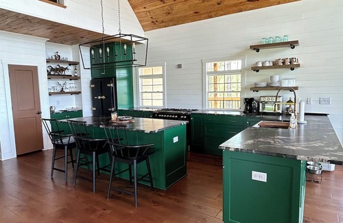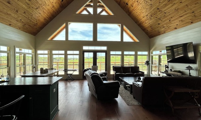 Custom Built Home in 2023 in the center of the Bourbon Trail in Kentucky. Enjoy the outdoors with hunting , fishing (fully stocked pond ) land is 50/50 split of woods and open fields. Hi The 2100 square ft cabin offers Three bedrooms and three bathrooms easily host 3 couples. Enjoy the 22 ft Ceilings, and Chalet Windows over looking the 3 acre pond (60ft deep). Property has a 740 Sq ft wrap around Porch, so you can see all of the beautiful views of the farm. The Property is 5 miles from the Bluegrass Parkway which allows easy and fast access to multiple distillery destinations. Numerous wildlife-deer, turkey, quail-you name it we have it. Also featured are numerous fruit trees and plants throughout the property. Pears, apples, and grapes! Each bedroom has a 55 inch tv , a 65 inch in the loft for gaming and a 75 inch in main living room. High speed internet 200mbs, allows you to work from the cabin and enjoy the land as a retreat from the office