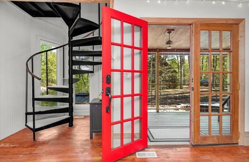 The Cave (Media/Entertainment Haven) with Pull-out Sofa: The Cave is located on the ground floor (half underground). This 995 sqft open floor plan features porcelain "wood looking" tile, a brand NEW (purchased April 2023) luxurious leather sectional that seats 5 people and includes a Queen size Pull-out Sofa. The Cave features a bar-height dining table (built with beautiful New Zealand pine) that comfortably seats 8. There is another "media table" behind the sectional that seats 3 (with charging station for those who like to multi-task). Your entertainment can be streamed (Apple TV) from the overhead projector and watched on the wall-size movie screen. The Cave features a fireplace that is perfect for use in the cooler Fall and Winter months (with stacked wood provided). French doors to the back of The Cave lead to the deck, 7-person hot tub, boardwalk, stone patio, firepit, private dock, and lake!