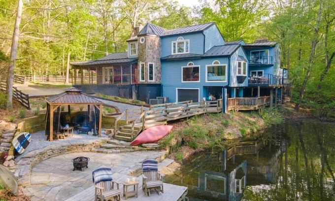 Luxurious 7,000 sqft lakefront property includes 7-person hot tub, concierge service, canoes, paddleboards, pool table, movie screen, King suites, 7 fireplaces, and breathtaking views of Lake Shannondale.