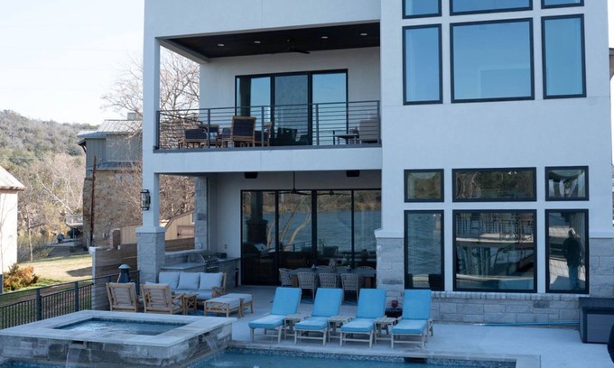 The Lyndon on Lake LBJ is a brand-new lake property located 3 minutes from Kingsland and a short 15 minutes from Marble Falls. It is a prime waterfront location on the constant level Lake LBJ. This is the ultimate family home boasting King-size beds along with built in bunk beds in four different rooms, a fully stocked chefs kitchen with a 6-burner gas stove, two full-size refrigerators, an upstairs TV room and two downstairs accessible rooms for anyone with mobility issues. The home enjoys top of the line Samsung TV's including 84" TV's in the downstairs living room and upstairs TV room, along with TV's in every bedroom and on the outside patio. The heated pool and hot tub are perfect for enjoying year round, while the lake is just steps away from your back door. The dock is a great amenity featuring stairs to get in and out of the lake, a table for outdoor dining, barstool chairs and hanging swings to enjoy fabulous sunsets, as the dock is westward facing. The dock even has submerged and automated green lights for nighttime fishing.
