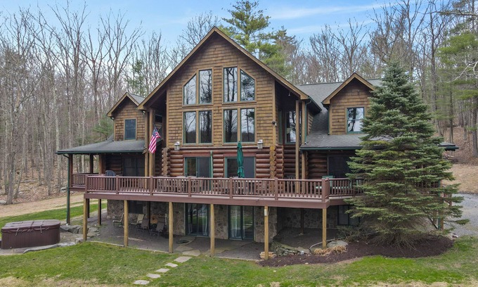 Swim off the dock or fish for bass and perch in the private 2 acre stocked lake, hike around the 17+ acres of privacy, enjoy camp fires out doors, play billards and video games in the family room, entertain at the wet bar, and take in the private mountain views from the livingroom from this beautiful custom log home. Home features a Master Suite on the first floor (king bed, overflow tub, massage shower), plus 5 additional bedrooms, 4 bathrooms, a massive 2 story stone fireplace. Gameroom, pool table, and large screen TVs provide for endless indoor entertainment, and the 17 acre playground makes this a top family vacation destination in the Lake Region/Lake Wallenpaupack! The property is just minutes from the free public boat launch on Lake Wallenpaupack. Put the boat in for the day and have fun on the 5,700 acre Lake Wallenpaupack, and still be home in time for dinner!