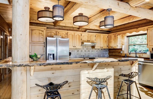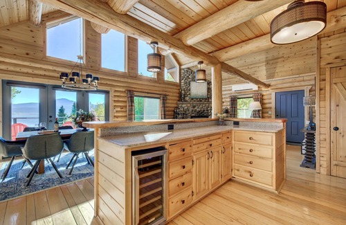 Drive through the lodge's towering log gate and then immediately soak in the 360 degree waterfront and mountain views. Next, enter the cabin on the 2nd floor which opens to the Great Room and kitchen. The wood burning fireplace towers over two dueling custom American made Bradington & Young distressed leather sofas, the finest hand made rugs, 10-person Restoration Hardware dining set + three barstools at the live edge bar- enough seating for everyone to enjoy meals together. The chef's kitchen has new Miele appliances and is fully outfitted with literally everything you will need to serve a gourmet meal to all of your party. No expense spared. The nearly 30ft tall great room is the main gathering spot and the best room for jaw dropping views. Off the great room is a wide wrap around deck with Adirondack chairs and the first of our two outdoor kitchens.