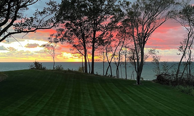 Lake Michigan Views: Expansive windows provide stunning views of the lake and the large backyard.