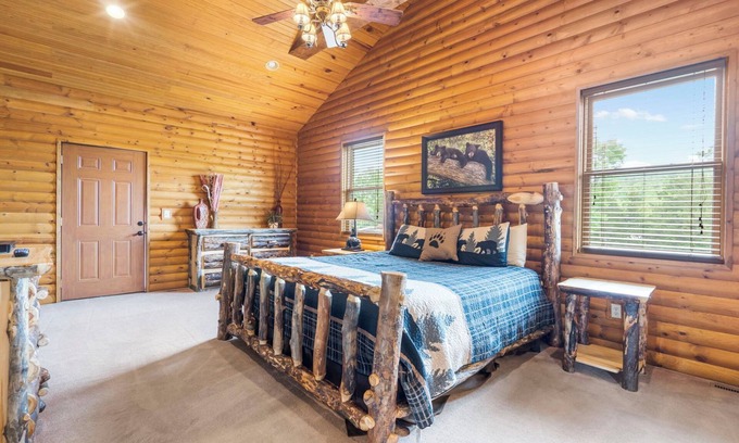 Another vaulted pine tongue-and-groove ceiling with wood beams showcases the King Master Suite, which makes up the entire upper level. You'll find complete comfort in the Serta presidential suite mattress, a luxury bathroom with a tiled shower, dual vanity sinks and a corner tub.