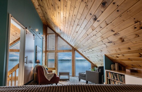 Upstairs Primary Suite: King bed, private en-suite, wall of windows with unbeatable lake views, plus a queen sleeper sofa for additional guests