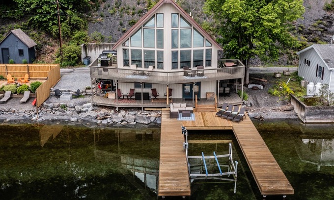 With 80 feet of private lake frontage, a solar-powered boat lift, and deep water for swimming or kayaking, this home offers everything you need for an unforgettable Finger Lakes escape - whether you're soaking in the sunrise from the top deck or winding down with s’mores by the fire pit.