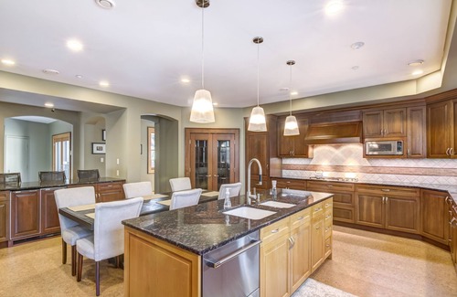 Huge kitchen with double ovens, warming drawers, produce drawers, butlers pantry, commercial dishwasher, and fully stocked so no need to bring your crock pots or dishware(unless you want to).