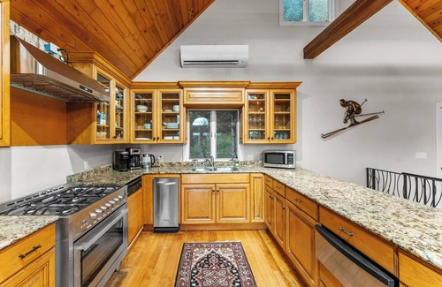 The kitchen is equipped with a ton of cooking stuff to whip up meals for the group. There is a large separate fridge and freezer, 36" gas stove, microwave, dishwasher, lots of small appliances you may need, plus a Keurig, coffee pot, kettle, tea and coffee to start off your mornings on the right foot! We also provide BBQ utensils for cooking and basic kitchen amenities such as olive oil, salt, pepper, aluminum foil and plastic wrap. It is a space meant for gathering!