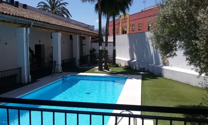 Luxury loft in Jerez de la Frontera, 800 m from the historic center of the city, with a capacity of 6 people, completely renovated with a luxury suite of 40 m on the top floor, with air conditioning and heating throughout the house, 2 full bathrooms, American kitchen with all appliances, dining room, lounge, 2 flat TVs, massage chair, wooden beamed ceiling, salt water pool, common area with picnic area. Very quiet and pleasant for an unforgettable stay.