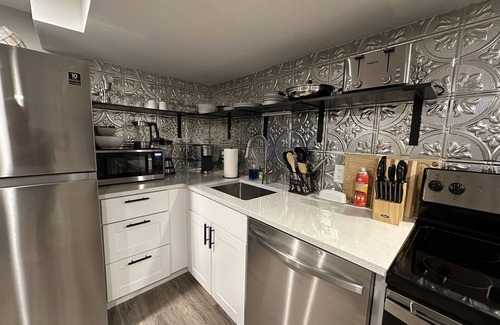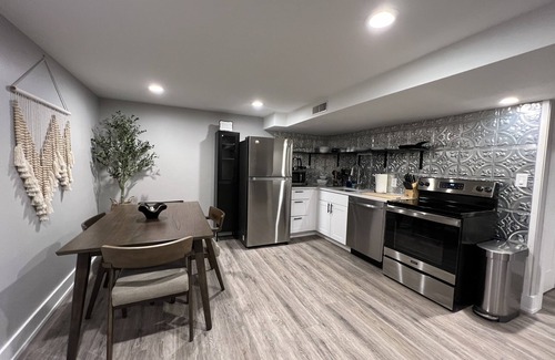 Sparkling clean! Historic tree lined street centrally located with fully fenced pet friendly yard with bbq grill and fire pit, fully stocked kitchen, private parking and the whole cozy basement apartment all to yourself with everything you'll need for your stay...Easy 2 minute walk across the street for groceries, coffee shops, pharmacy, and many restaurants! The street is very family friendly and you can enjoy a stroll around the block under the canopy of trees or relax in the park a block away