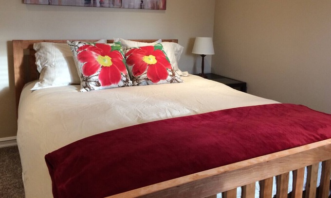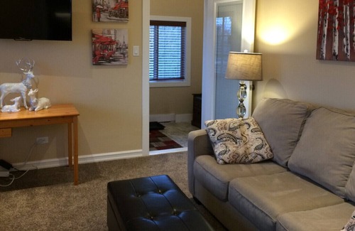 The suite has wireless internet access, Telus OpticTV and in suite washer and dryer. The luxury bathroom has a clawfoot soaker tub and heated floors. The home is beautifully landscaped, with off street parking located at the rear of the property. The kitchen is fully equipped with pots, pans, chef knives, china, cutlery, glassware, stemware and is stocked with coffee, tea, sugar, spices and condiments.This 9th Avenue Guesthouse is located in a quiet residential neighbourhood in downtown Prince George, within easy walking distance of UHNBC, shopping, the downtown business district, restaurants and fitness facilities, with a beautiful park, playground and tennis courts located only one block away. Perfect for the business traveller or anyone who prefers a quiet, private, home away from home.