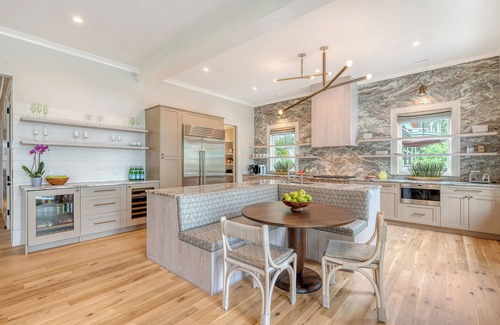 Inside, the home is custom-designed to impress and welcome. The open-concept living room is bright and airy, featuring cushioned furnishings around a sleek modern fireplace with a floating mantel and a pale tiled chimney wall. Built-in window seating provides a cozy perch to soak in the views. The adjoining kitchen is a chef’s dream—fully equipped with premium appliances including a Wolf® 6-burner cooktop, Sub-Zero® refrigerator, Bosch® dishwasher, and undercounter wine and beverage coolers. An ice maker, Keurig, and nespresso machine offer everything needed for a relaxing stay. The showpiece of the kitchen is a dramatic stone slab wall flanking the range, offering beauty and function.