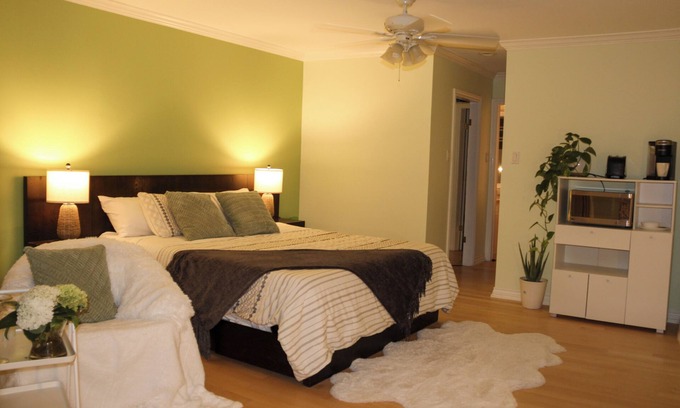 Wake up to birdsongs, sweeping river and treetop views from this sun-drenched 600 sq. ft. master suite perched on the third floor of an elegant home. From the moment you step inside, you’ll feel a sense of calm and space — a perfect sanctuary for long-term stays. The suite features: