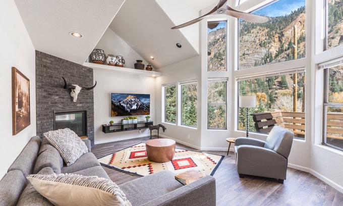Find tranquility at this beautifully decorated 2-bedroom + loft, 2-bath home in Ouray, designed with a modern mountain style and breathtaking views. Vaulted ceilings, upgraded kitchen appliances, and stylish furnishings make it both inviting and comfortable. Large front windows overlook the soaring canyon walls and the Uncompahgre River, while a cozy gas fireplace and 65-inch Smart TV offer the perfect space to unwind after a day of adventure.