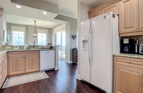 You'll notice right away that Paros 606 is a finely decorated, spacious and clean condo. Your 6th-floor, corner unit offers an open floor plan with crown molding, beautiful paint colors, and sophisticated accents. The living room will quickly become a favorite hangout spot with fine leather couches, plush armchairs, and a 65” Smart TV with DVD and Blu-ray player. Step through the sliding doors to the balcony and enjoy the sights and sounds of the Atlantic Ocean from comfortable patio furniture. Mornings are best spent here with fresh coffee, sunshine, and sea breezes.