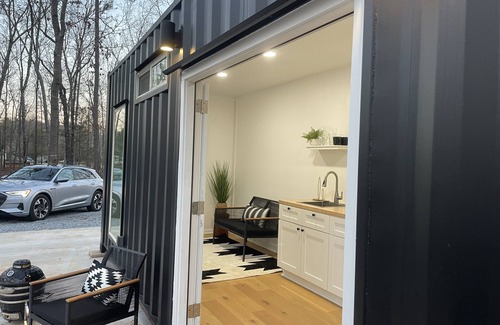 This modern luxury container home has it all: Private bedroom, bathroom with a spa like shower, kitchen plus a living space! The space is cozy, but spacious with doors opening to deck with a fire pit and outdoor seating area with a grill. Be sure to check out the trails! The sleek modern interior is a beautiful contrast to the peaceful wooded surroundings. The fully stocked kitchen includes a stove, countertop convection oven, microwave and refrigerator. K Cup coffee and coffee maker provided, and a drip coffee maker is available. You will find everything you need to make your stay enjoyable in the unique, but stunning converted container! Property still has trees down from recent hurricane, please be careful if you chose to walk the trails.