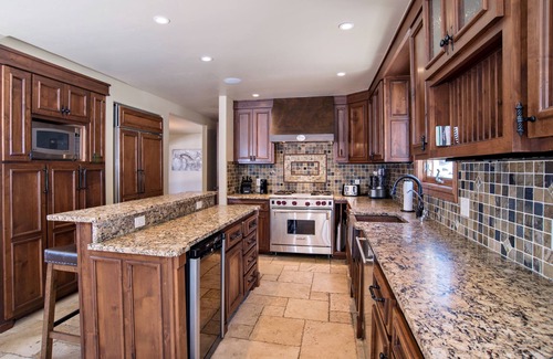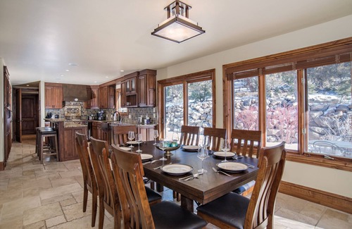 The impressive great room features high ceilings, oversized windows with spectacular mountain views, leather furnishings and a gas fireplace. The gourmet kitchen, with high end stainless steel appliances and stone countertops, is fully stocked and there is seating for 10 with the dining room table and breakfast bar. After a long day of skiing or exploring the Roaring Fork Valley, star gaze while soaking in the hot tub, relax on the back patio or enjoy game night near the fire.