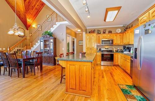 The kitchen, located on the main floor, is equipped with full size appliances, dinnerware and cookware. There are both a standard drip coffee maker and a Keurig for your convenience. The laundry room is on the main floor, too.