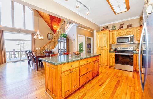With 28-foot vaulted wood ceiling, gas fireplace, full length windows and hardwood floor in the living room and kitchen area, this chalet is for everyone. There is a 42" satellite television in the living room. Each bedroom has it's own television. The back of the chalet is a large 50-foot deck with a hot tub and BBQ grill.