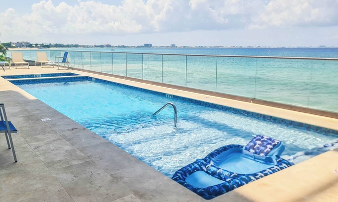 Exclusive access to a shared oceanfront pool, heated spa, and rooftop lounge is reserved solely for owners and guests.