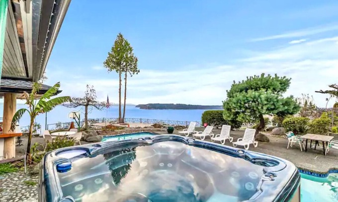 Breathtaking Saltwater Island and Mountain Views, brilliant seascape spectacles, Resort Amenities pool (seasonal heated) with the Pool house. outdoor full kitchen, over 8000 sqft luxury living space on 2.48 acres. You will enjoy staying the beautiful resort.