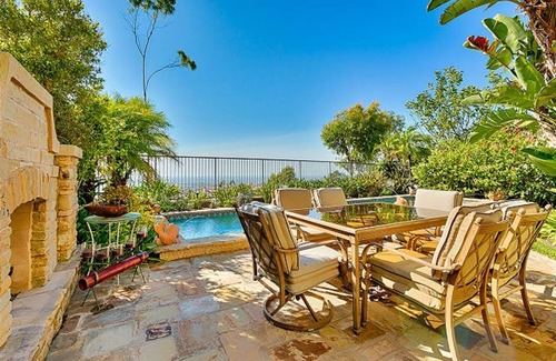 Sit at your private pool in the backyard and enjoy the panoramic views of the ocean and Catalina island. The pool/backyard area is lush and private and comes complete with a stone fireplace, a large sitting area, and a built in barbecue.