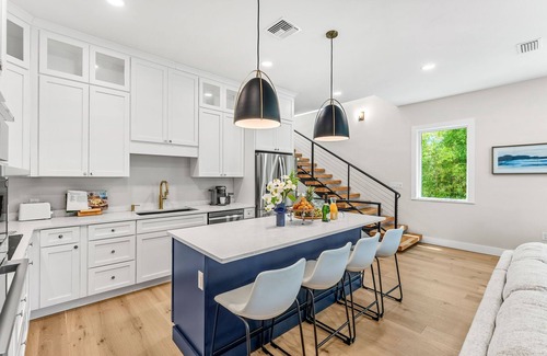 Sleek kitchen with quartz counters, stainless steel appliances, and island seating