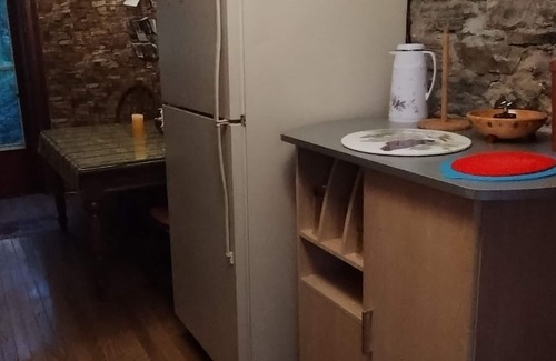 The Luxury Rose Jacuzzi suite and The Luxury Paris suite they are on opposite sides of the house and have the stone walls and the common kitchen between them. Both share the private entrance, the fully equipped kitchen, the deck and fire pit area.