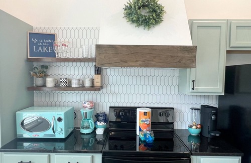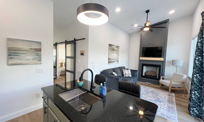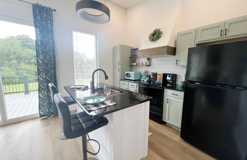 Just completed this one bedroom one bathroom (sleeps three) modern lean cottage is in a very desirable location. Situated a stones throw from South Holston Lake and Painter Creek marina this property is stunning. Both Bristol and Abingdon are about ten minutes away and the new Hard Rock Casino is about fifteen minutes. The Bristol speedway is approximately fifteen minutes as well. Relax on the large deck and enjoy the gas fire feature table. The bedroom is behind double glass panel barn doors and has a king bed with super comfy mattress. Hi end luxury linens await you. The bathroom is large and has a tiled walk in shower, sink with light up mirror and water closet. The living room boasts twelve foot ceiling and has a couch that fold out to a queen bed, a comfy chair, a gas fireplace and massive windows to view the outdoors and the massive deck. The living room is open to the full kitchen with a granite top island, full fridge, oven, microwave, Nepresso coffee maker, sink and dishwasher. This property is truly an oasis. It is easy to relax here as it is peaceful and quiet. Come try it out. We guarantee you won’t be disappointed. Bring your boat as we have plenty of space for it.If this one is booked for your dates please check out our other vaca rental, vrbo property number 2675915. We do allow one dog per stay, less than 20 lbs but we have to pre approve and the pet fee must be paid. No other pets are considered.