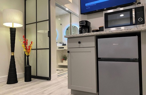 LOCATION, LOCATION, LOCATION. This brand new private suite comes with its own private entrance and parking. It is designed with your comfort in mind with very comfortable memory foam bed, luxury bathroom, 55' smart TV and very fast WI-Fi. 10 min from beautiful beaches and 3 min from Downtown Gardens. Even though our suite does not have a full Kitchen, it's equipped with Microwave, mini fridge and coffee maker.