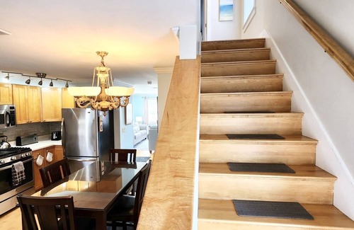 Upstairs you'll find two spacious bedrooms, each with brand new mattresses (as of Fall 2022), skylights that fill the rooms with natural light, and flat-screen TVs. One bedroom features a king-size bed, the other a queen, both with hardwood floors and air conditioning for ultimate comfort.