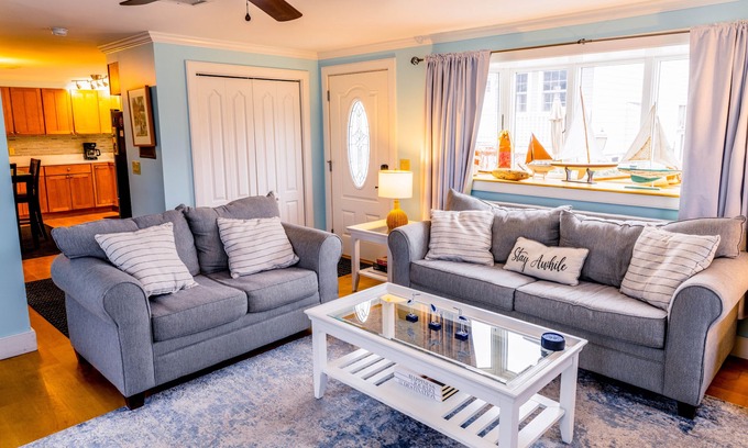 Step into a spacious, sunlit living area featuring gleaming hardwood floors, a brand new leather couch and loveseat, and a flat-screen TV. The living room opens to a private front porch and a cozy patio, ideal for morning coffee or evening cocktails. A queen-size pullout sofa bed offers additional sleeping space. The gourmet eat-in kitchen is fully equipped with all the amenities of home—including a lobster pot—along with a full-size refrigerator, gas stove, microwave, and all necessary cookware. A full bathroom and a brand new washer/dryer unit add to the convenience. The back door leads directly to your assigned parking space.