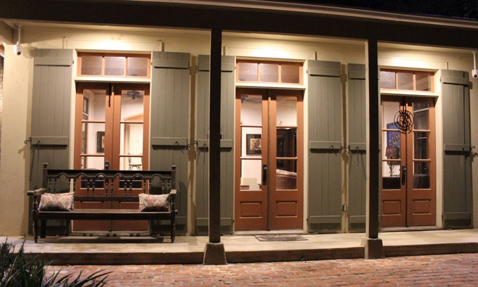 The crown jewel of this sprawling property however, is the 3,834+ SF compound comprised of a 2,384+ SF main residence and 1,500 SF Party Barn entertainment center. The 3 bedroom, 3 bath home’s design is infused with a French Colonial and Texas German style, creating a sophisticated, yet warm feel. Abundant natural light and fresh air flow through the welcoming abode courtesy of 15 sets of elegant French doors. Detail was paramount in the design from the custom doors and shutters, to the long-leaf pine floors, ceiling beams, and columns.