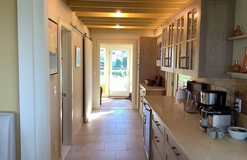 The main entry leads from a sunlit mudroom to an open plan kitchen, dining and living room complete with a gas fireplace and bar. The kitchen, with a built in dining nook, is fully appointed and features high quality appliances (including an induction cooktop) and cookware to satisfy the most discerning cook. Additional kitchen appliances include a wine bar and an espresso machine.