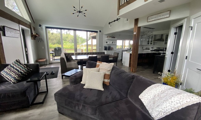 A true sanctuary, this 2200 sq ft multi-level luxury chalet comfortably sleeps 10 including adults/children & features 3 bedroom (3 kings), + 1 dbl bunk, + 1 trpl bunk and a full memory foam mattress sofa sleeper + 3 full bath + 1 steam bath + 1 sauna. Option (ask) to add adjoining unit #8 to sleep 12 total. Smart TVs, gourmet kitchen, gas fireplace, laundry, dishwasher, wifi. 2 story floor to ceiling glass great room, huge deck & spectacular views out onto the pond. 1 min drive to village, 4 minutes to Holimont, 6 minutes to Holiday Valley. This is part of a multi complex unit consisting of 4 additional units. All are complete separate units, set up with privacy and their own entrances, parking and deck/patio spaces.