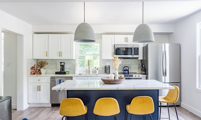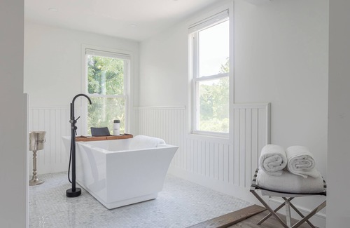 Step onto your covered front porch, and enter through the big glass doors equipped with coded self-locking locks. A Fully stocked kitchen built for cooking and large living area with dining area and smart TV, await you on the ground floor--perfect for gathering and entertaining! Kurig coffee maker-with pods, blender, toaster, spices, baking pans, and pretty much anything else you would need are all in the kitchen. The Primary suite is the entire 2nd level, with 2-person soaking tub in the corner overlooking the Rondout Creek (complete with champagne bucket stand), and private sitting area. On the 3rd floor you'll find 4 equally-sized Queen bedrooms, a grand bathroom with 12 foot ceilings and views of the river. Each bathroom has a towel warming bucket and personal heater for those chilly nights. The beds are all tempur-pedic, with luxury hotel linens, and down-filled duvets and pillows. Everything in the home is brand new and intricately curated for a stay that rivals 5-star hotels.