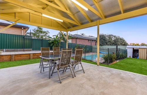 Spacious modern bedroom with sleek private bathroom on a private upper floor. Includes access to pool, patio, kitchen, and dining area. 5 mins to railway station and Macarthur Shopping Centre. Inflatable mattress available for up to 4 adults can be provided at additional cost. Airport or city pickup offered for a fee.