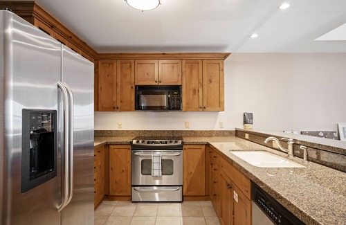 Its decor is simple and elegant, and it features in-unit laundry, a fully-equipped kitchen, a heated garage for two vehicles, and high-speed WiFi in the room. The Lodge amenities including ski and bike valet, a fitness center, a pool & hot tub, as well as a dry sauna.